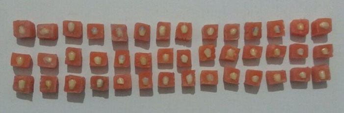 In general, 42 extracted caries-free, unrestored erupted permanent first and second premolars were used in this in-vitro experimental study. The teeth were not hypo-plastic and were collected during the past 5 months. Then, the teeth were disinfected in a 0.5% chloramine solution and placed in distilled water for up to 1 month. After polishing surfaces, each sample was evaluated for the absence of any dentin exposure using a low-speed handpiece and water. The roots were then cut using a diamond disc 1 mm under CEJ, and sample surfaces were polished using 400, 600, and 1200-grit abrasive papers) Silicon carbide, 400, 600, and 1200-grit, Germany). To evaluate the microhardness of samples, teeth were mounted in an auto-polymerizing acrylic resin ) GC-UNIFAST III, GC Company, Japan( in metal molds measuring 2 cm x2 cm such that a piece of the buccal enamel (4 mm ×6 mm) remained exposed and the sample number was carved at the bottom of each frame by a bur (Figure 1). Then, they were placed in distilled water and transferred to the metallography laboratory of Material Engineering School of Hamadan University for measuring microhardness. After drying the samples, microhardness was measured at the center of the polished area in each sample using Vickers hardness tester) Buehler, Lake Bluff, IL, USA(. For this purpose, 50 g load was applied to three points at the center of each sample with 500, 1000, and 1500 µ intervals for 10 seconds by the diamond indenter of the device (Figure 2). Each load application created a diamond shape indentation on the samples. The two diameters of each indentation were measured by a micrometer under a microscope. The mean value indicating the microhardness of each sample was referred to as the ‘Vickers hardness number’ (VHN).