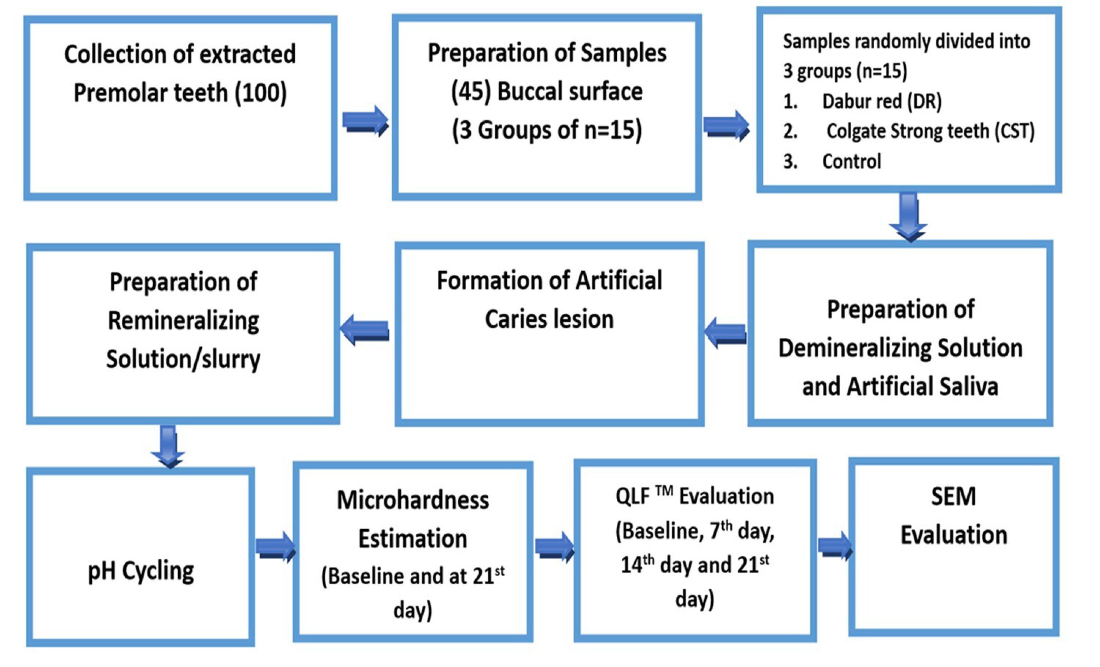 One hundred freshly extracted maxillary pre-molars (indicated for orthodontic extraction) were collected and screened for inclusion in the study. The samples were provided by the Department of Oral and Maxillofacial Surgery. The collected samples were carefully cleansed of debris, calculus, and soft tissue before being evaluated for inclusion and exclusion criteria. After being cleaned in 0.1 M P buffer (pH = 7.4) and rinsed with deionized water, the samples were refrigerated in distilled water at 4°C until use. The inclusion criteria were caries-free teeth, therapeutically extracted teeth, and teeth with baseline zero fluorescence loss (QLF screening). On the other hand, the exclusion criteria were teeth with hypoplastic lesions, teeth with intrinsic stains, teeth with abrasion, erosion, and attrition, teeth with developmental anomalies, and teeth with restoration.