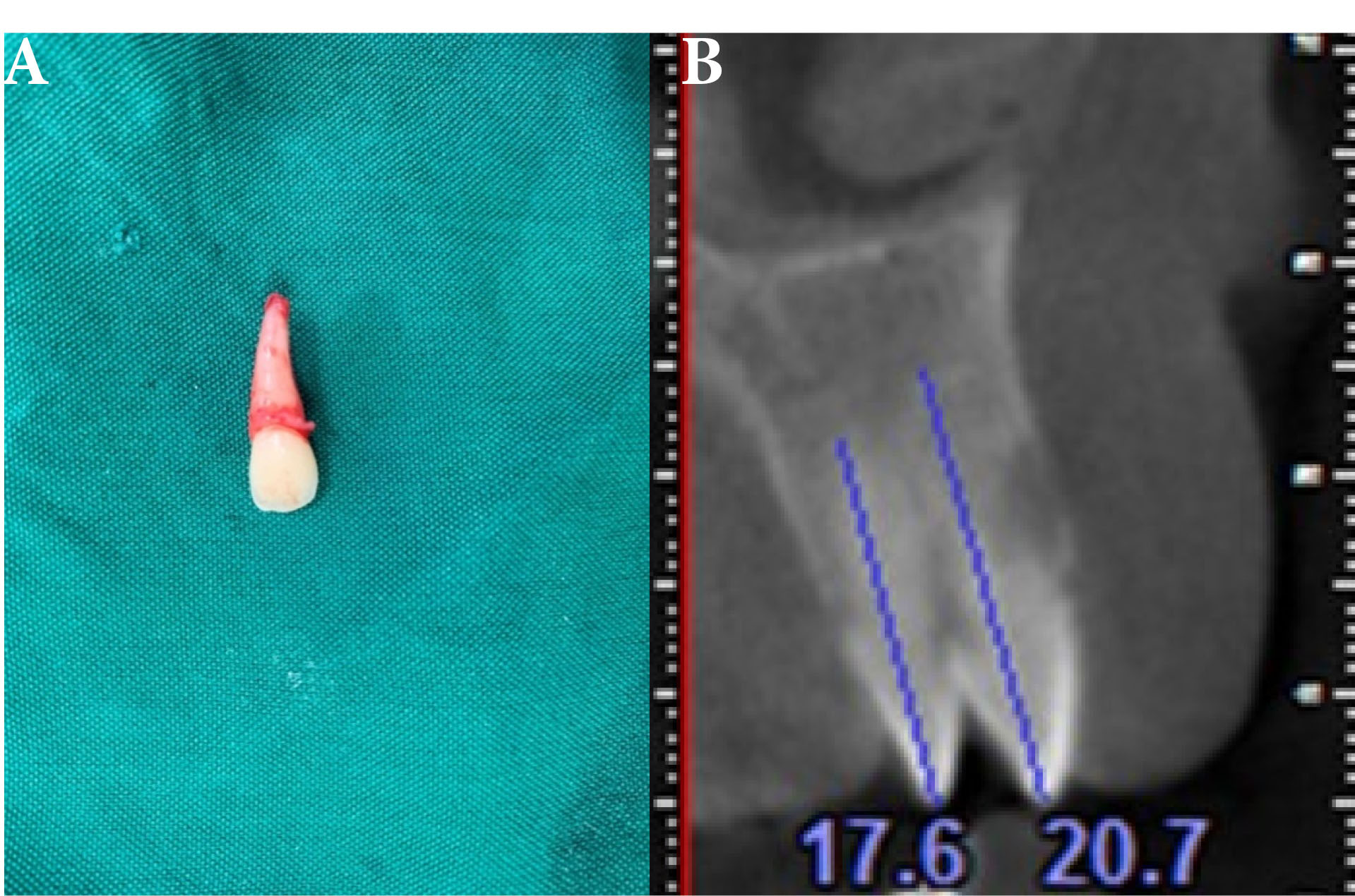 Supernumerary Teeth. (A) Extraction of supernumerary teeth. (B) CBCT axial cut.