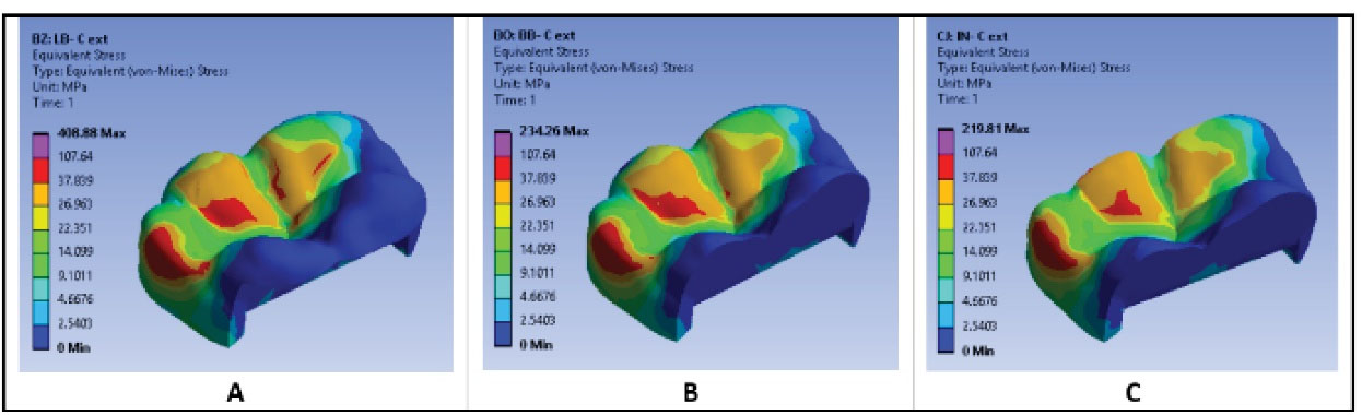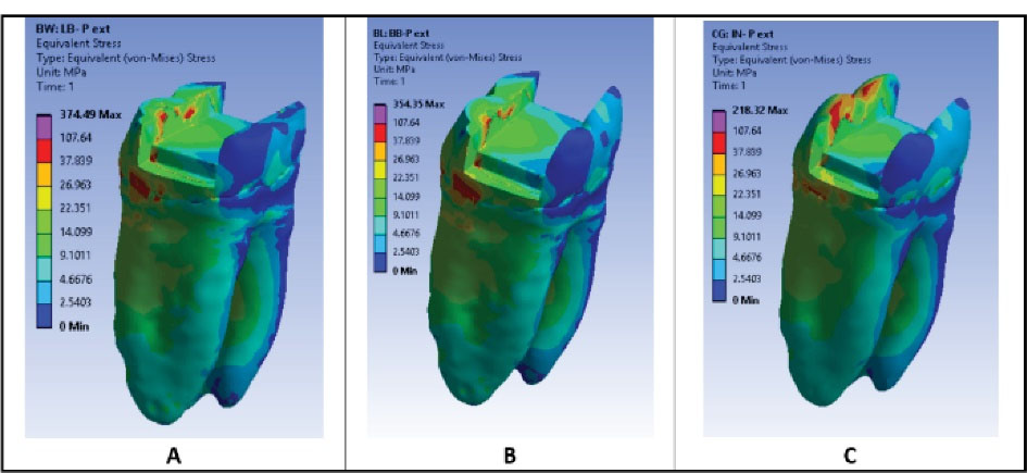 Stress Distribution in PICN Restorations: (A) LB onlay model (all cusp coverage), (B) B onlay model (buccal cusp coverage), (C) Inlay model.